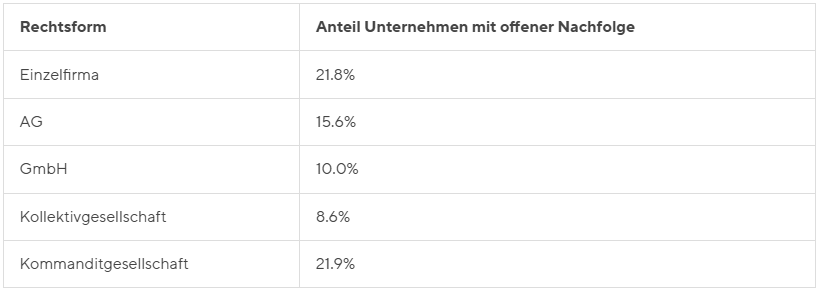 Untersucht man die drei am häufigsten vorkommenden Unternehmensformen (Einzelfirmen, Aktiengesellschaften sowie Gesellschaften mit beschränkter Haftung) hinsichtlich ihrer offenen Nachfolgeproblematik, ergibt sich, dass Einzelfirmen (Personengesellschaften) mit den grössten Herausforderungen konfrontiert sind. Stolze 21,8 Prozent der Firmen dieser Rechtsform haben ihre Nachfolge noch nicht geregelt. Im Vergleich dazu beträgt der Anteil an Unternehmen mit einer offenen Nachfolge bei den Kapitalgesellschaften wie der AG 15,6 Prozent und der GmbH 10,0 Prozent.
