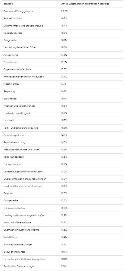 Offene Nachfolgen nach Branche